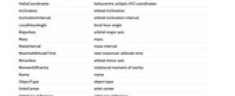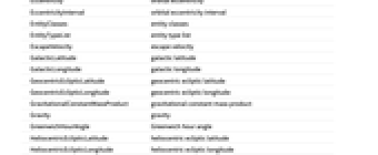 AlphanumericName alphanumeric name AlternateNames alternate names Altitude altitude AltitudeTransit next transit altitude AngularDiameterFromEarth angular diameter AngularRadiusFromEarth angular radius ApparentAltitude apparent altitude AverageOrbitDistance average orbit distance Azimuth azimuth AzimuthRise azimuth at rise AzimuthSet azimuth at set BooleanRise above the horizon Classes classes Component component Constellation constellation DailyTimeAboveHorizon daily time above horizon Declination declination Density mean density Diameter average diameter DiameterInterval diameter interval DiscoveryDate discovery date DiscoveryMethod discovery method DistanceFromEarth distance from Earth DistanceFromSun distance from Sun DistanceInterval distance interval DurationTransit transit duration Eccentricity orbital eccentricity EccentricityInterval orbital eccentricity interval EntityClasses entity classes EntityTypeList entity type list EscapeVelocity escape velocity GalacticLatitude galactic latitude GalacticLongitude galactic longitude GeocentricEclipticLatitude geocentric ecliptic latitude GeocentricEclipticLongitude geocentric ecliptic longitude GravitationalConstantMassProduct gravitational constant mass product Gravity gravity GreenwichHourAngle Greenwich hour angle HeliocentricEclipticLatitude heliocentric ecliptic latitude HeliocentricEclipticLongitude heliocentric ecliptic longitude HelioCoordinates heliocentric ecliptic XYZ coordinates Inclination orbital inclination InclinationInterval orbital inclination interval LocalHourAngle local hour angle MajorAxis orbital major axis Mass mass MassInterval mass interval MaximalAltitudeTime next maximum altitude time MinorAxis orbital minor axis MomentOfInertia rotational moment of inertia Name name ObjectType object type OrbitCenter orbit center OrbitCircumference orbit circumference OrbitPeriod orbital period OrbitPeriodInterval orbital period interval PeriapsisLongitude longitude of periapsis ϖ PeriapsisLongitudeInterval longitude of periapsis interval PlanetaryEquilibriumTemperature planetary equilibrium temperature PlanetaryEquilibriumTemperatureInterval planetary equilibrium temperature interval PrimaryStarKSemiamplitude primary star K semiamplitude Radius average radius RadiusInterval average radius interval RightAscension right ascension RiseTime next rise RocheLimit Roche limit SemimajorAxis orbital semimajor axis SemimajorAxisInterval orbital semimajor axis interval SemiminorAxis orbital semiminor axis SetTime next set SiderealHourAngle sidereal hour angle SurfaceArea surface area TransitDepth transit depth TransitTime next transit time Volume volume ZenithAngle zenith angle